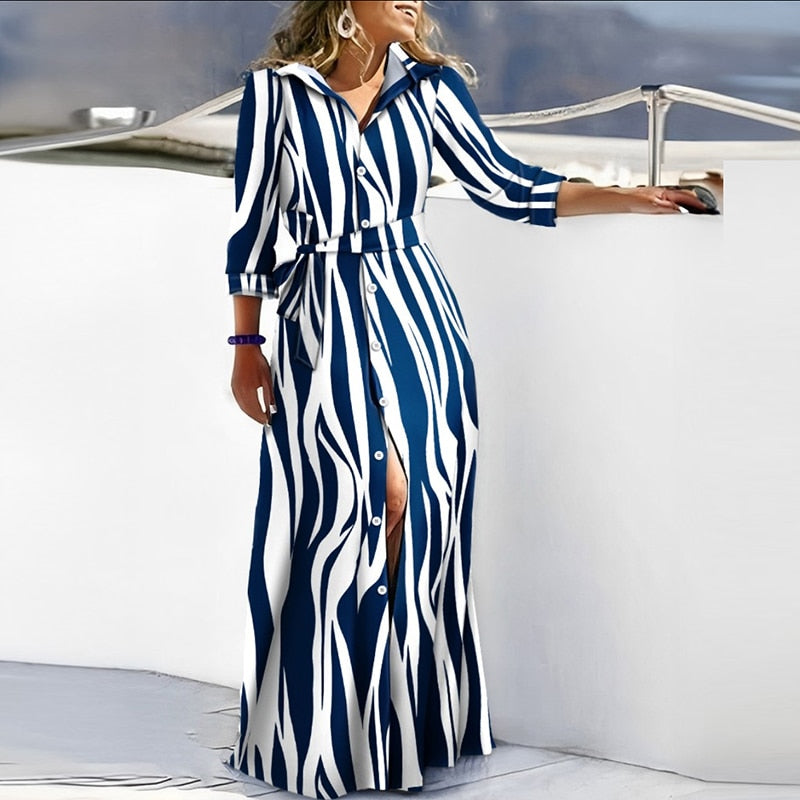 Maxi Print Dress with front closure. Waist band for an adjustable silhouette.Classy and fashionable for any occasion.