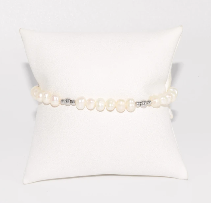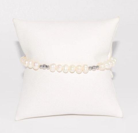 Silver and pearls bracelet to complement your outfit with a delicate and fashion look. Create a unique touch in your jewelry accessories with this bracelet.Material: ElasticDetails: PearlsDetails: silver beads